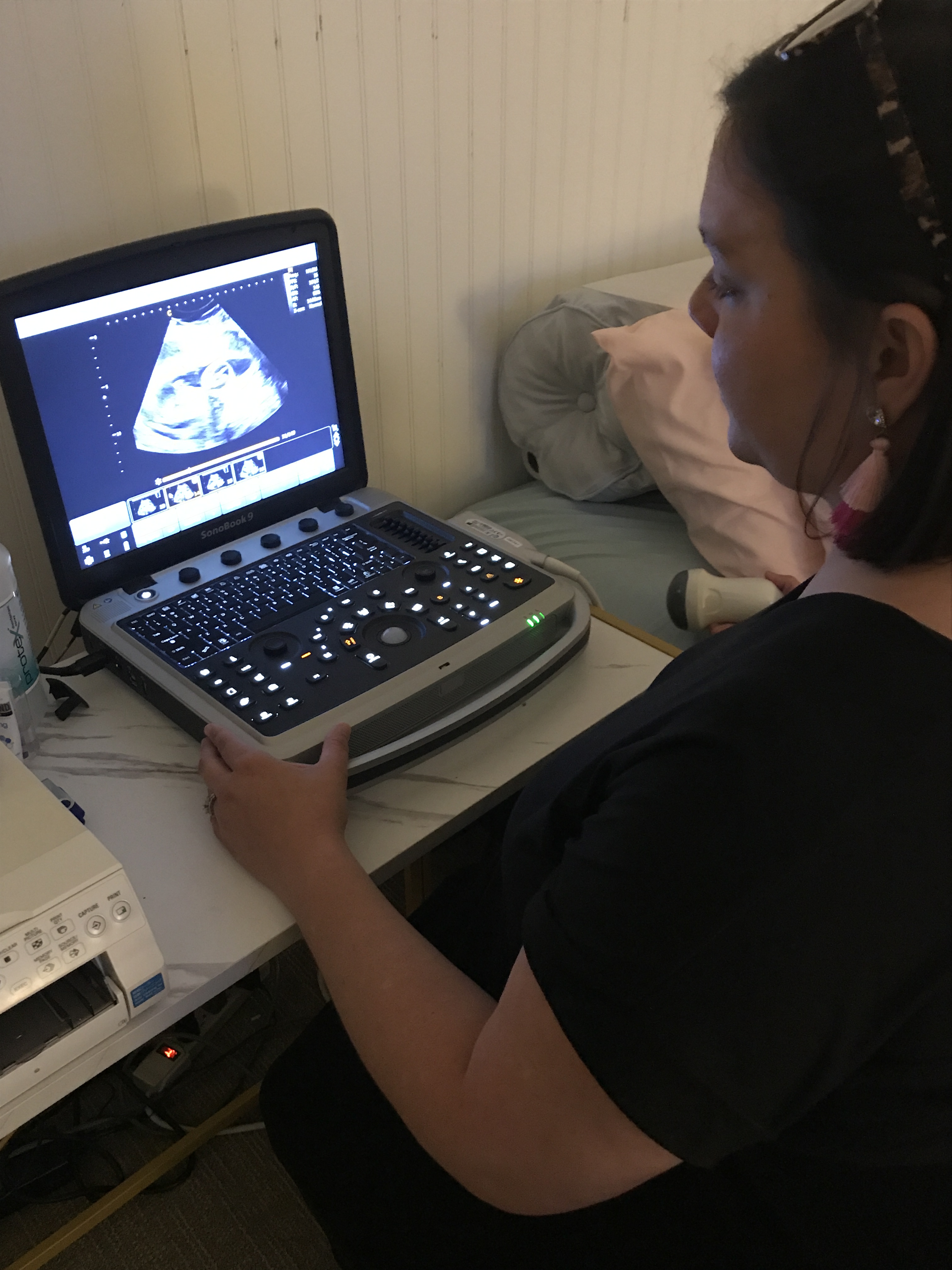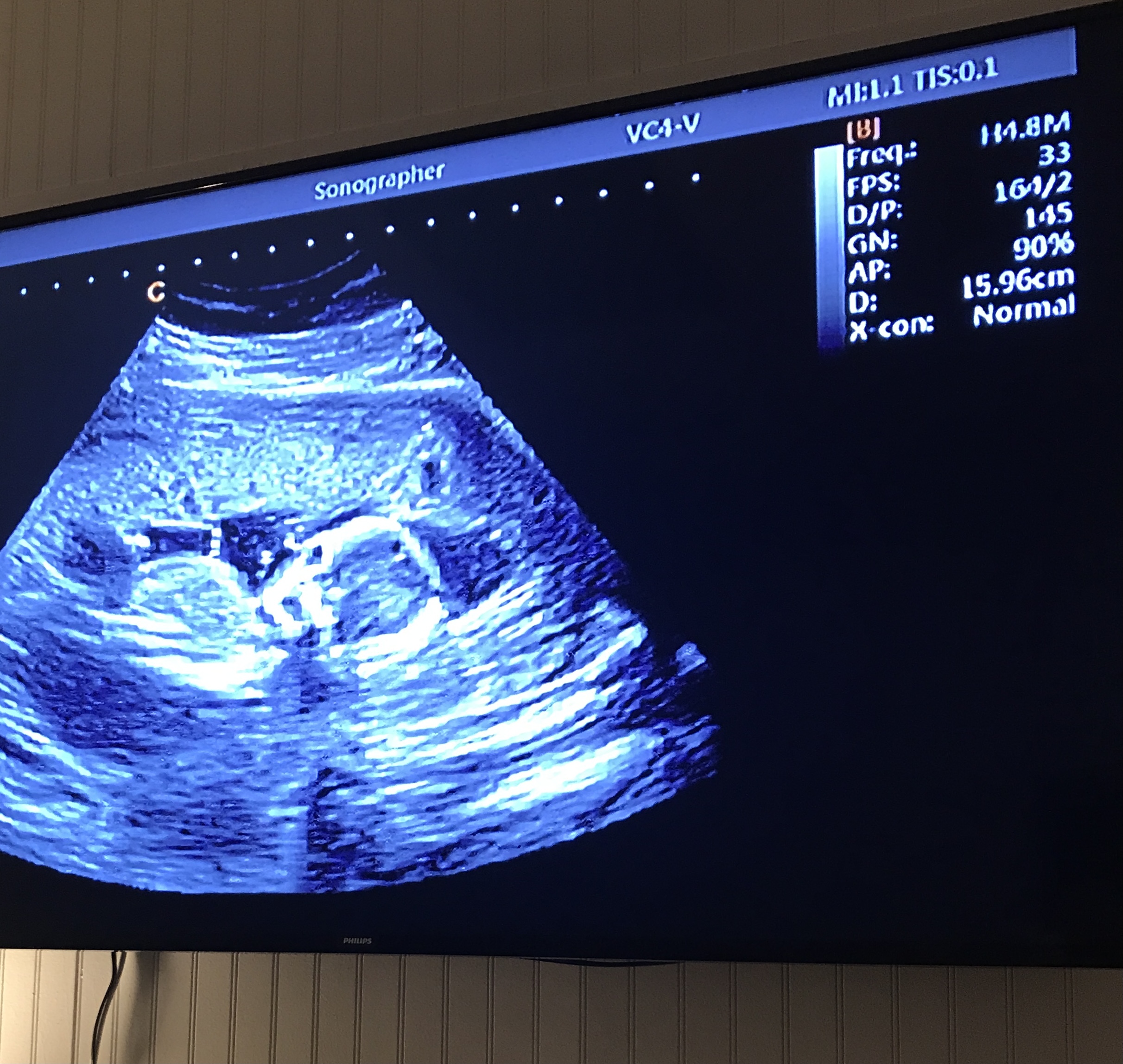 Gates performs the ultrasounds in a large, comfortable room that can accommodate about 15 people. Images, or video, of the baby are shown in real time on a large screen television.